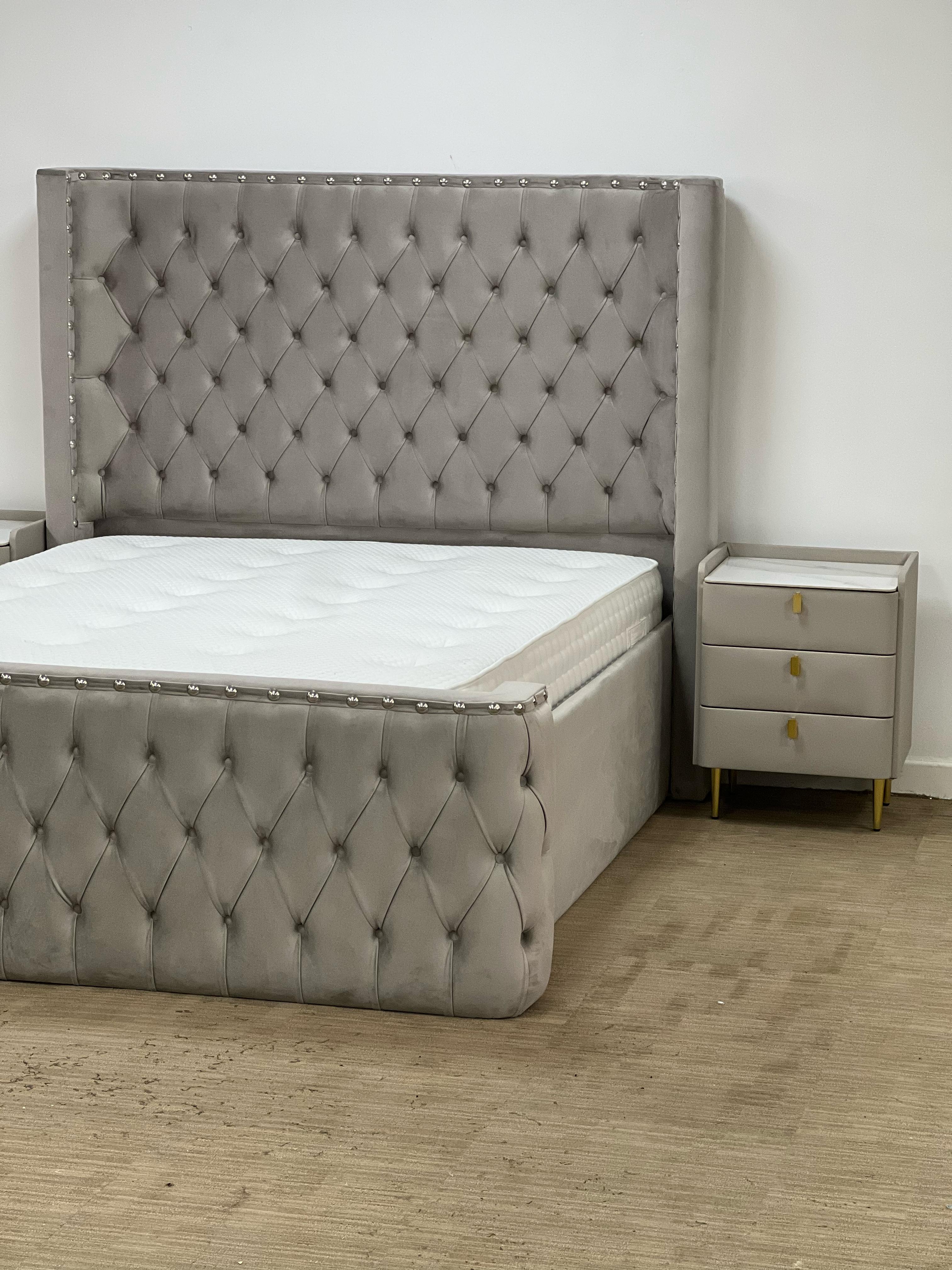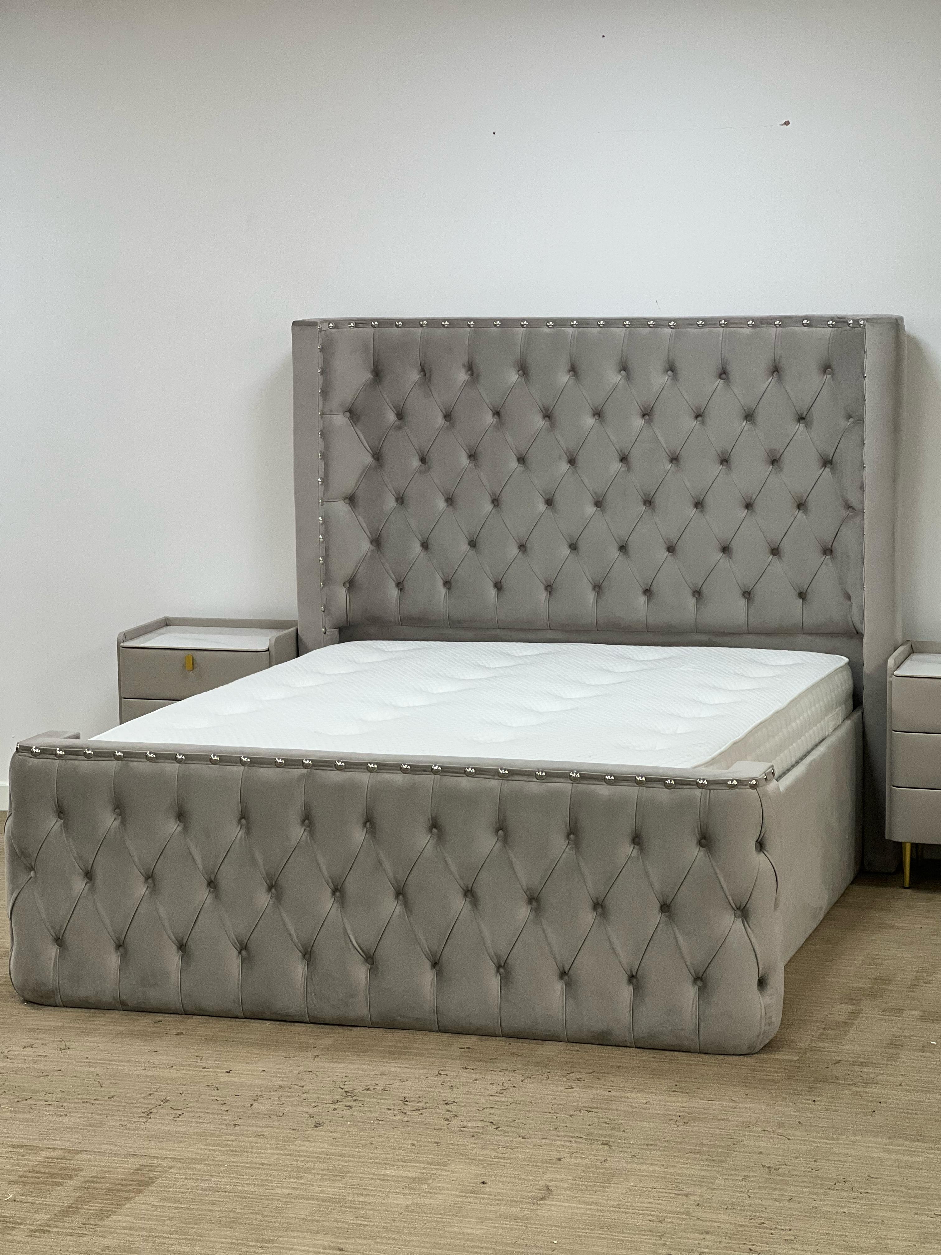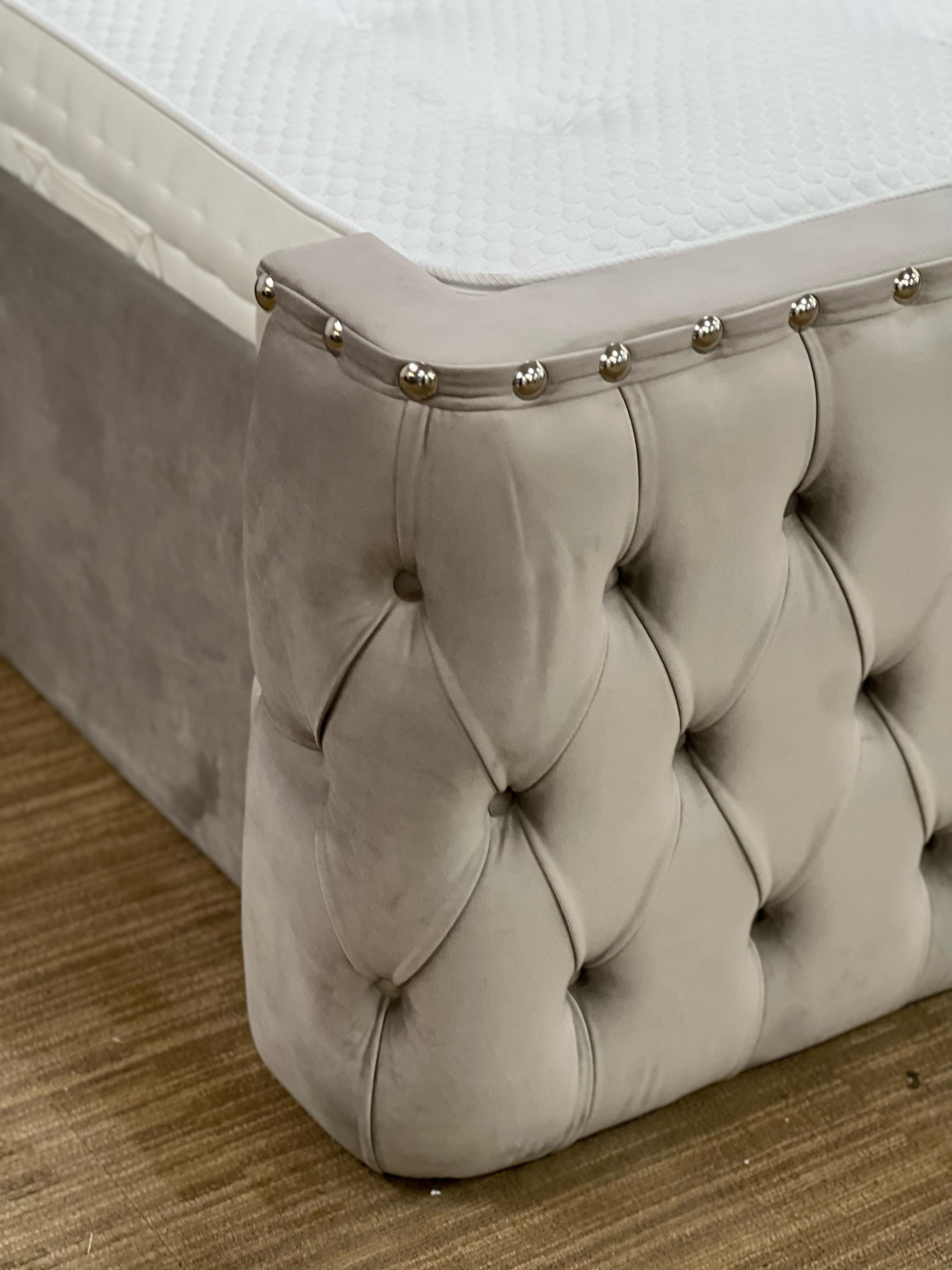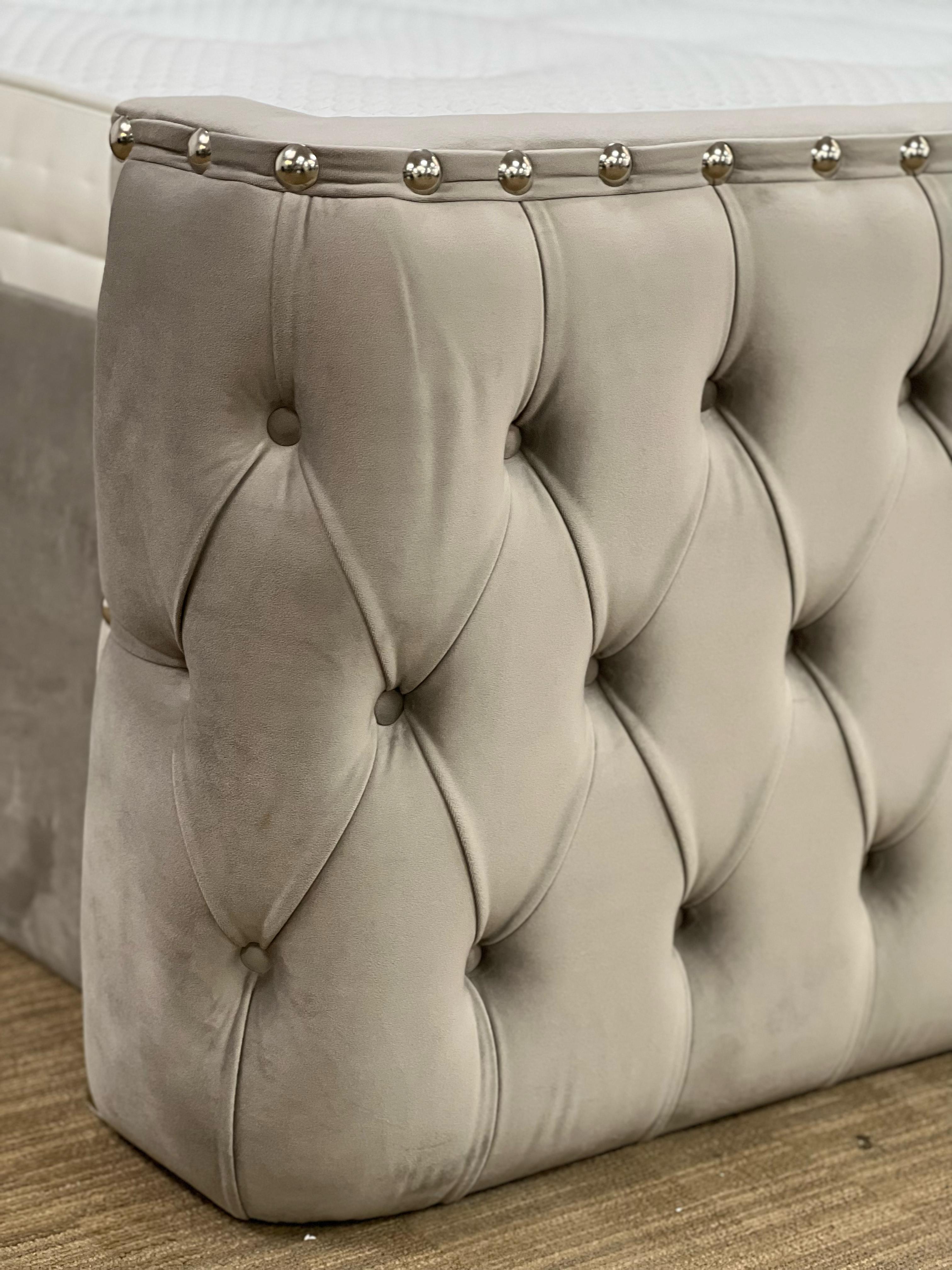 Elevate your bedroom with the Modern Maybach Chesterfield Bed, a stunning fusion of heritage design and modern sophistication. This bed showcases the signature deep tufted Chesterfield headboard, exquisitely accented by shimmering silver stud detailing, creating a refined statement piece that blends timeless elegance with a sleek, contemporary vibe.