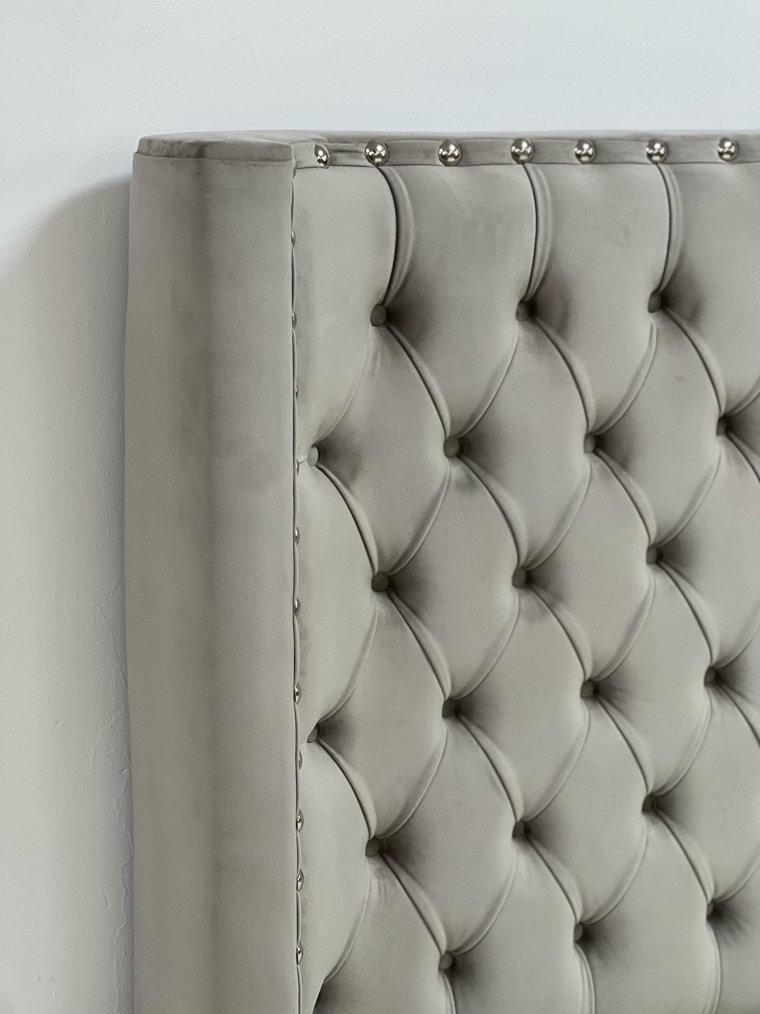 Iconic deep buttoned Chesterfield headboard enhanced with distinctive silver stud trim