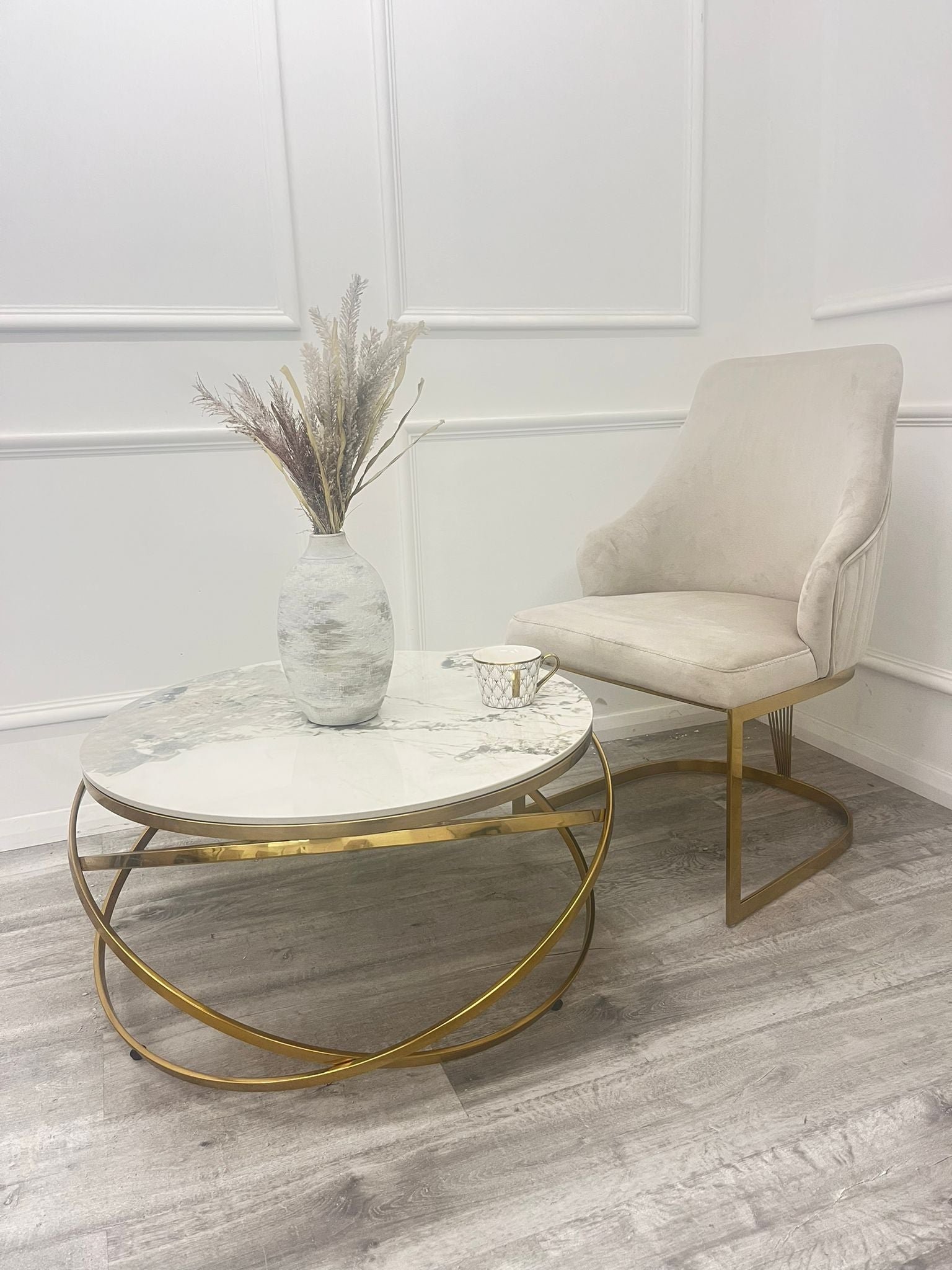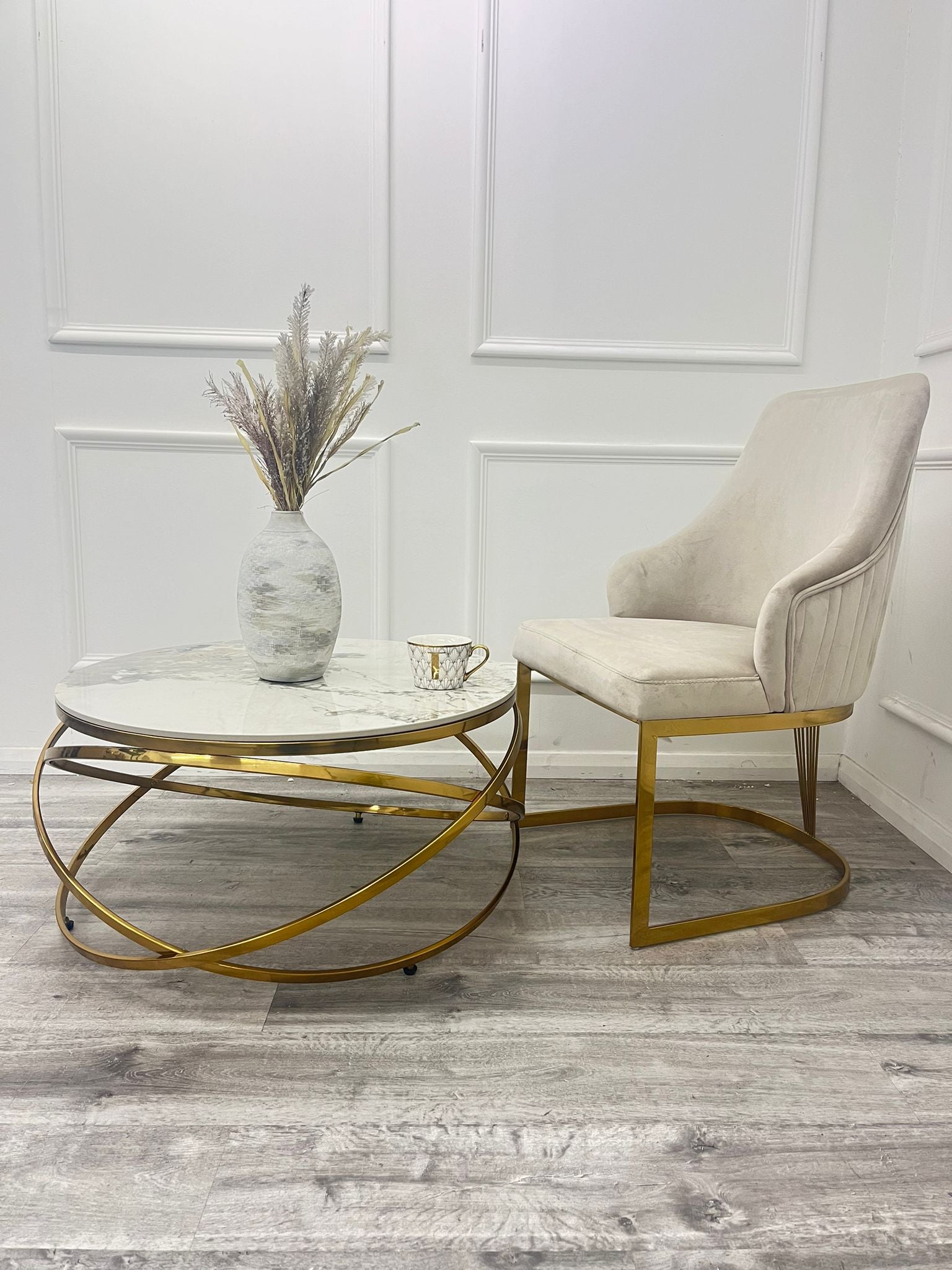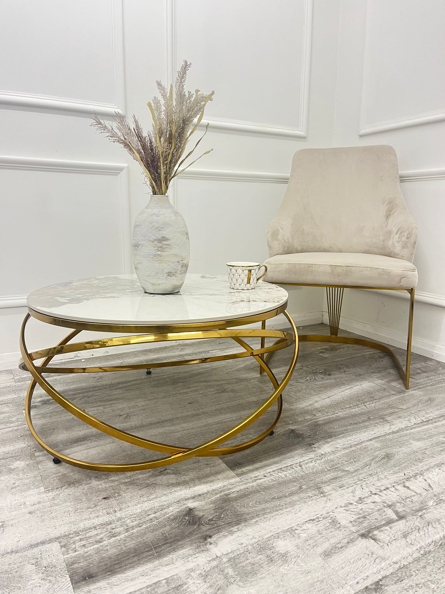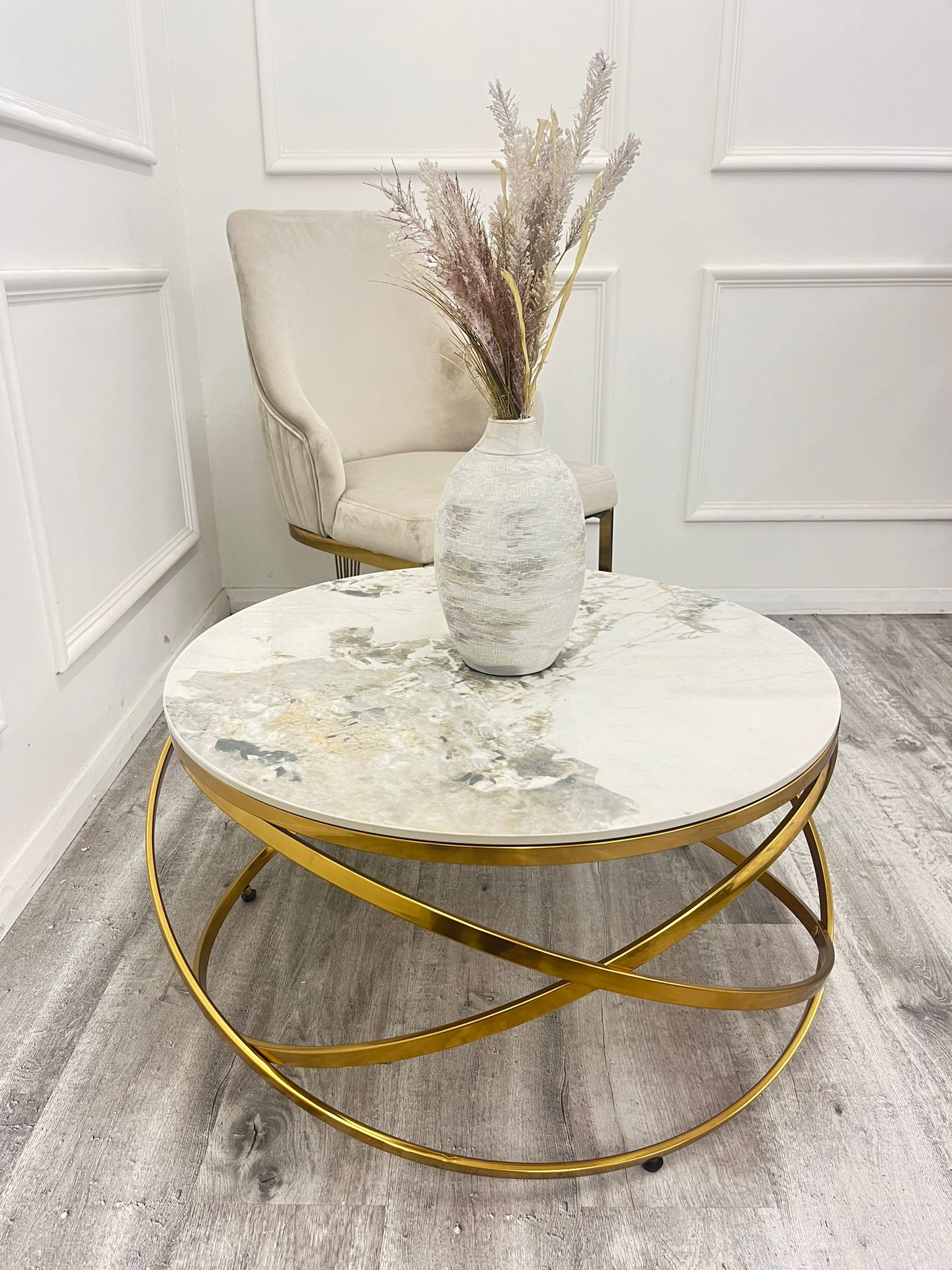 This contemporary coffee table features Pandora sintered stone tops placed on an elegant gold metal frame comprising of 3 rings